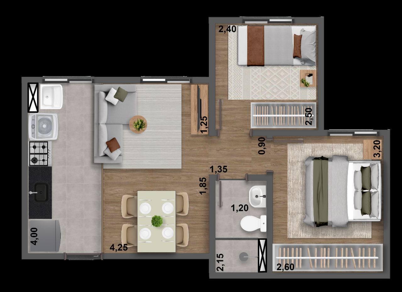 Os espaços foram projetados para garantir conforto no dia a dia, integração entre sala e cozinha e melhor aproveitamento da metragem, ideal para quem busca o primeiro imóvel pelo Minha Casa Minha Vida.